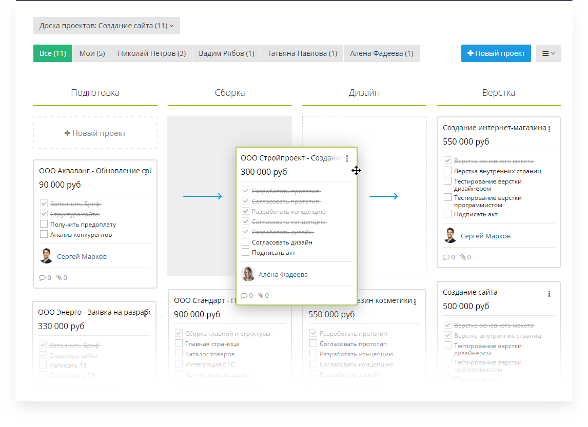 Полный контроль работы. На доске менеджеров вы сможете увидеть, кто перегружен, а кто сидит без дела. Это позволит вам отладить управленческие решения и обоснованно оценить работу сотрудников.
